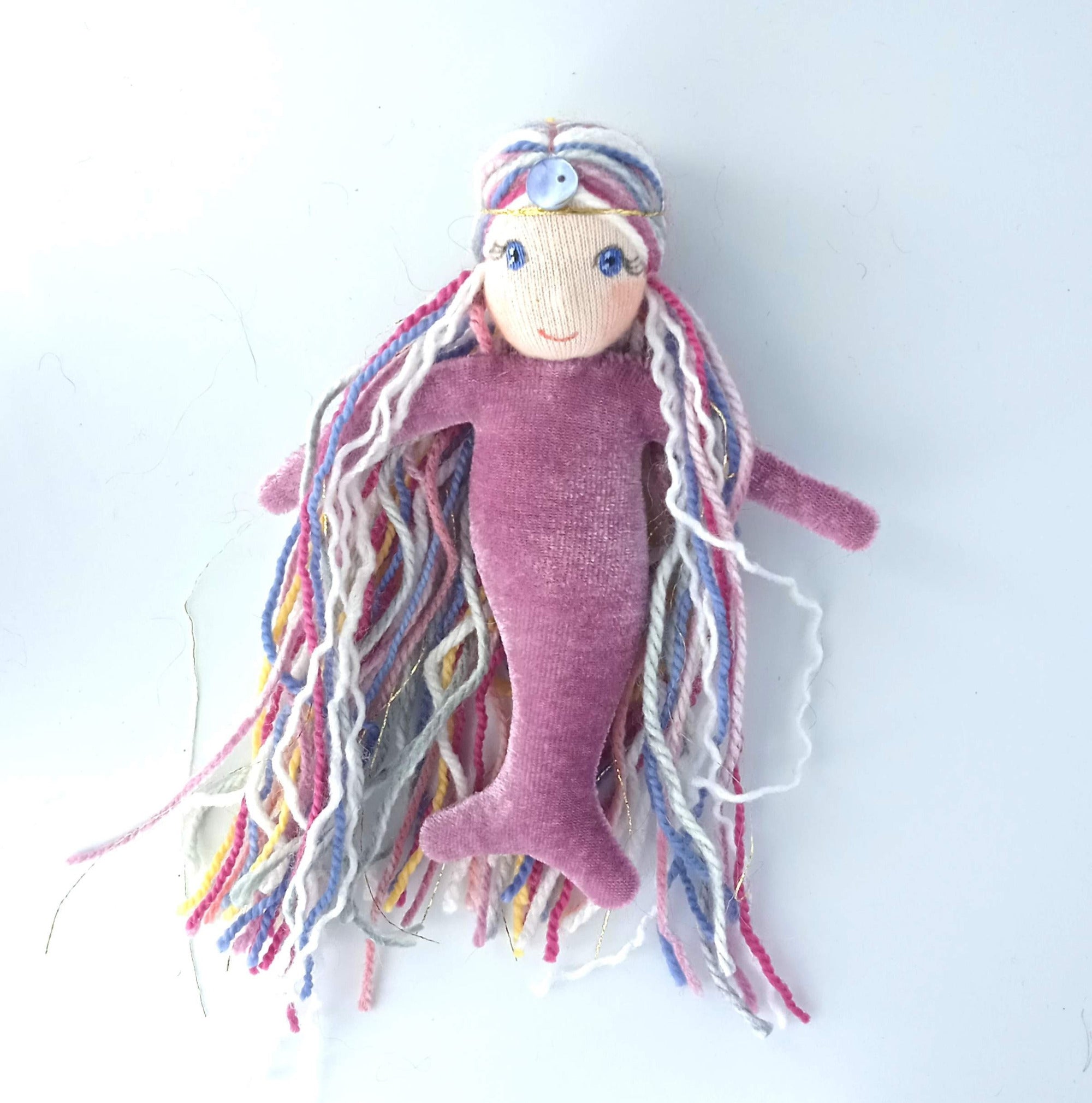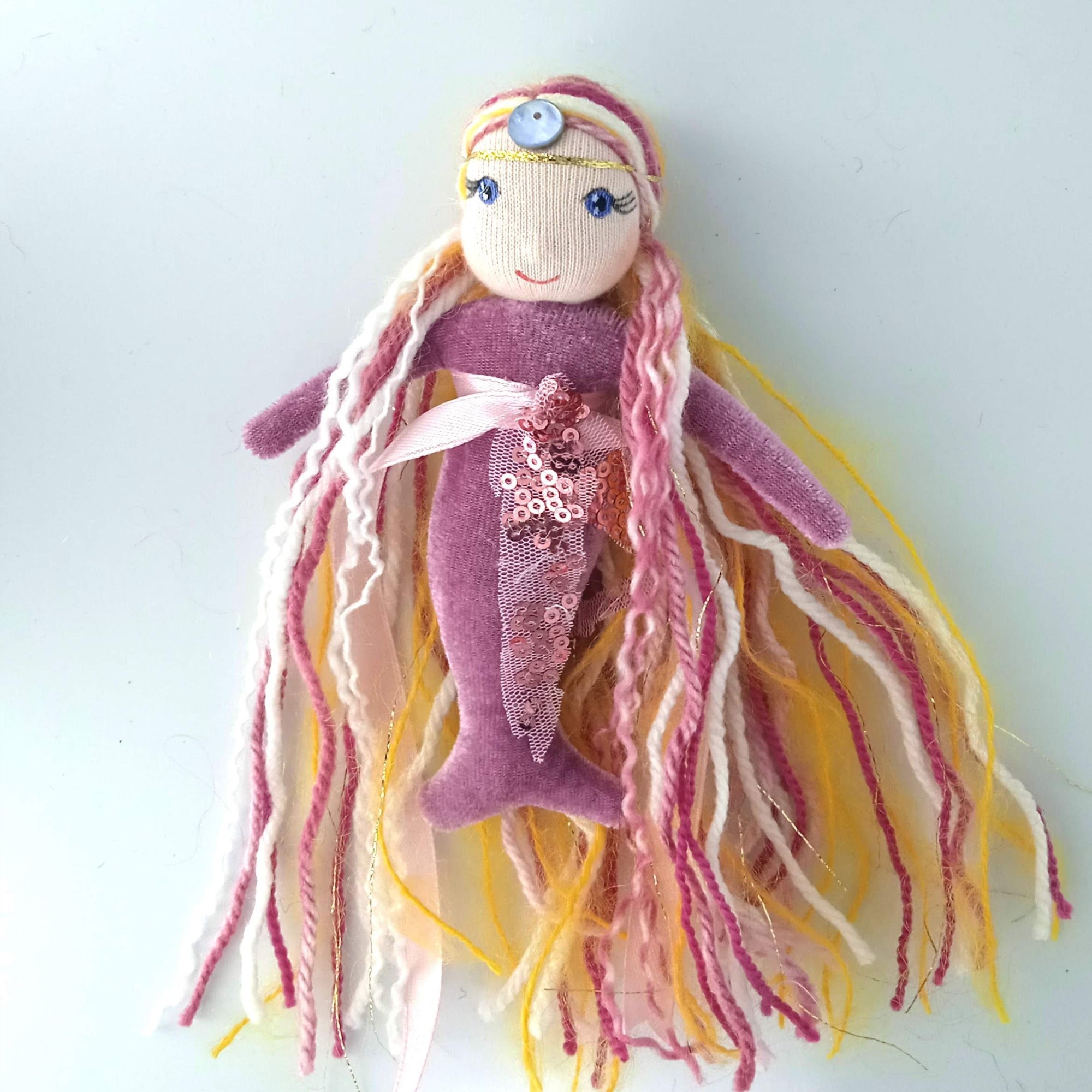Die kleinen Meerjungfrauen sind aus einer Auswahl an wunderschönen Stoffen mit ganz viel Liebe von Hand gefertigt. Ihr langes Haar reicht bis zu den Zehen, wo die langen Beine von einem eleganten Ozeanschwanz verdeckt ist. Als Krone verziert sie, je nach Design, eine echte Perle, ein Paillette oder eine hochwertige Stoffstickerei. Sie passen mit gerade einmal 14 cm perfekt in jede kleine Kinderhand, Puppenhäuser und Handtäschchen und verzaubern Groß und Klein.
